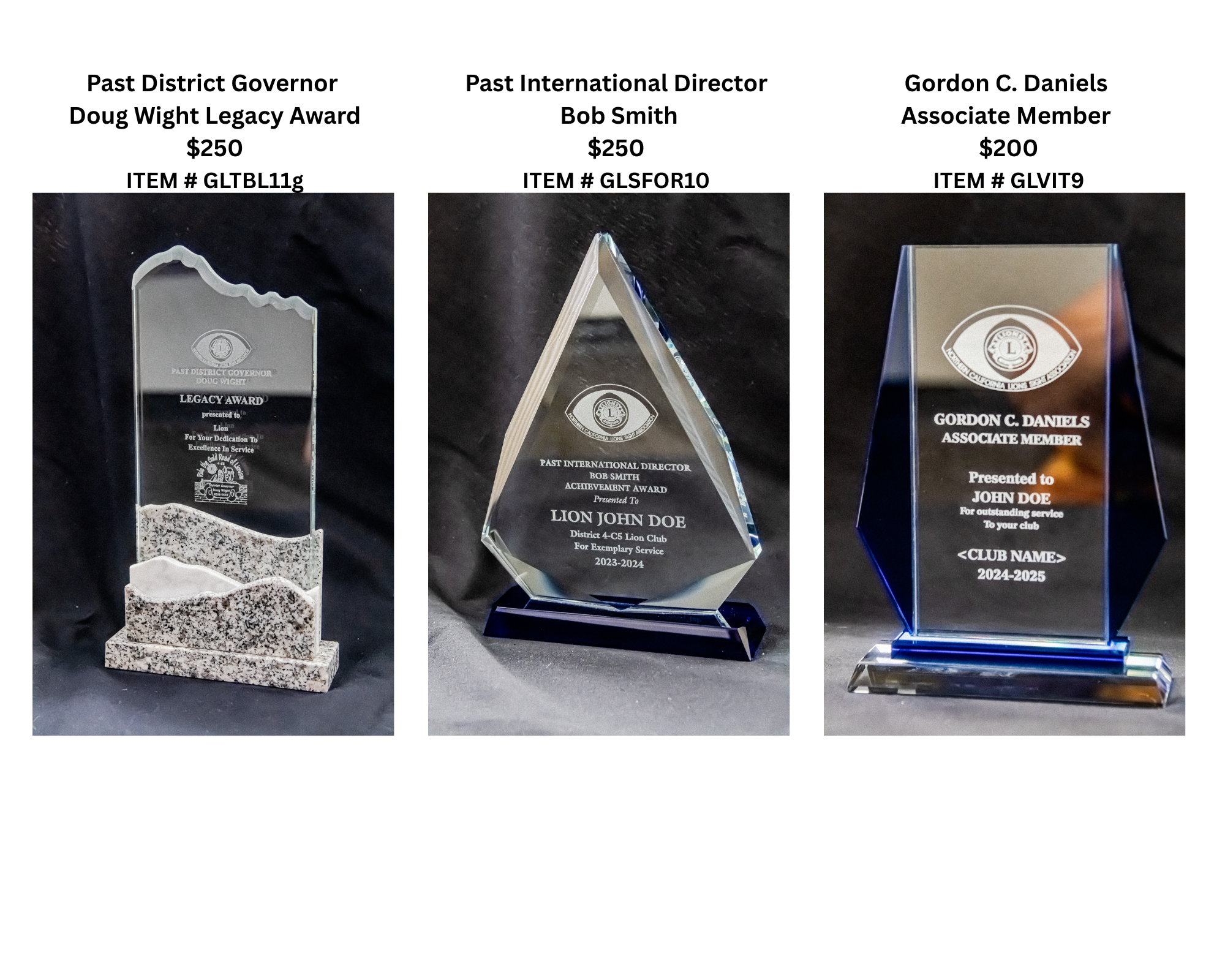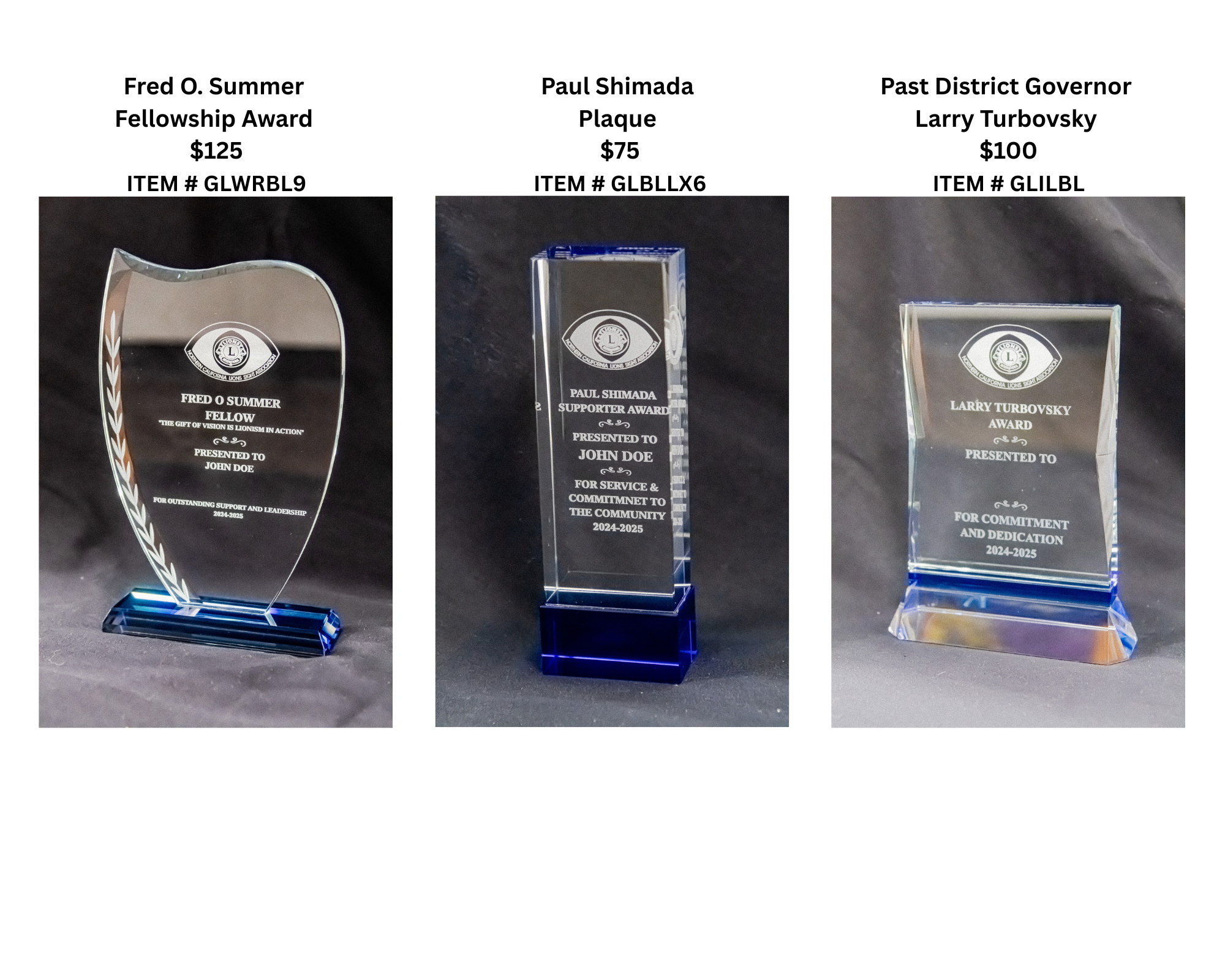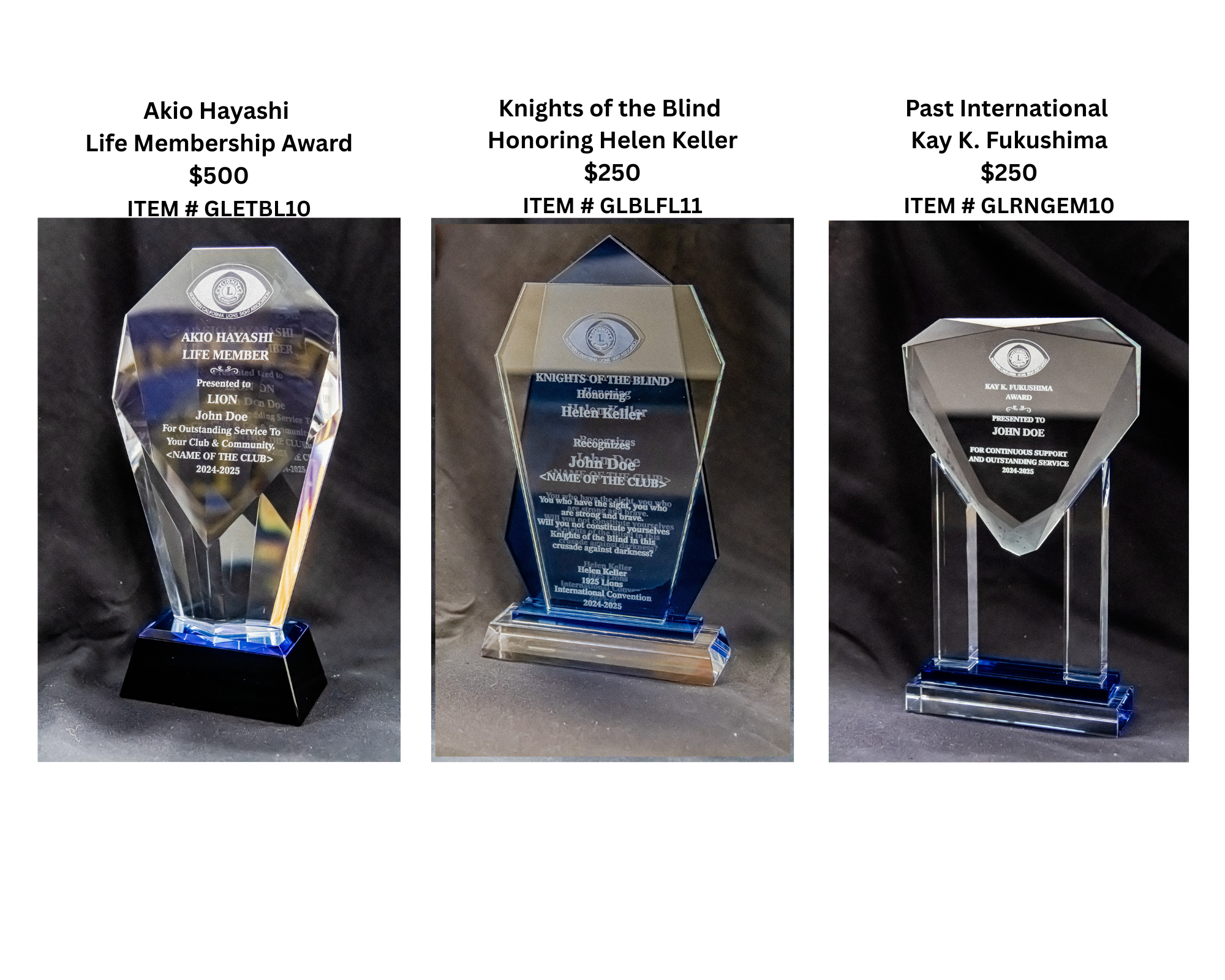 Awards & DonationsThe funds that allow NCLSA to sponsor individual's eyesight needs in our Community are generated by the interest from Trust Funds.These Trust Funds are in large part, funded by the awards shown on this page. Please support NCLSA by purchasing these awards for your Club Members, Business Associates and Friends.